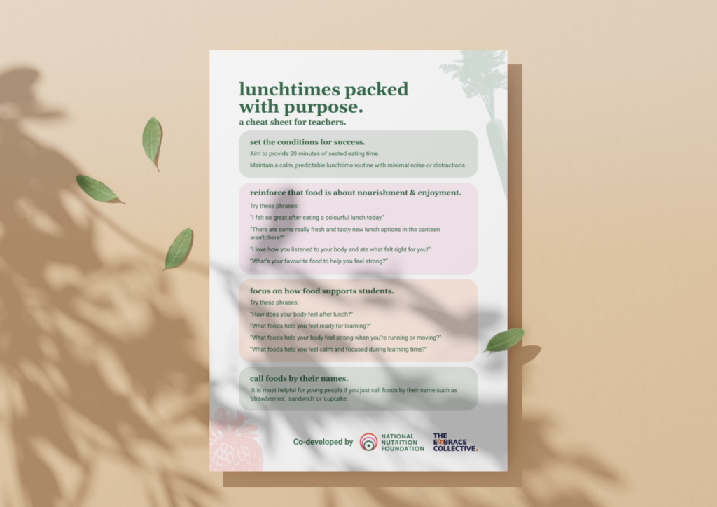 Lunchtimes Packed with Purpose is a guide developed by the National Nutrition Foundation and The Embrace Collective, offering practical tips to help teachers navigate lunchtime challenges and support children to build positive, lifelong relationships with food and their bodies.